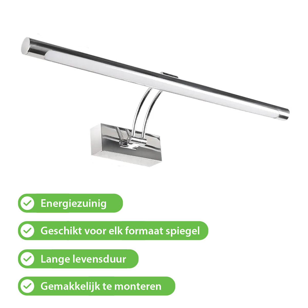 Maak kennis met onze hoogwaardige chrome spiegellamp. Met behulp van de nieuwste LED-verlichtingstechnologie, verbruikt onze spiegellamp minder energie dan traditionele verlichting en gaat deze ook nog eens veel langer mee. Het moderne en strakke ontwerp past perfect bij de stijlvolle inrichting van uw badkamer. De spiegellamp geeft voldoende helder warm-wit licht en is voor elk formaat spiegel geschikt. Investeer in de veiligheid en duurzaamheid van uw badkamer. Gratis verzending, 30 dagen bedenktijd en garantie.